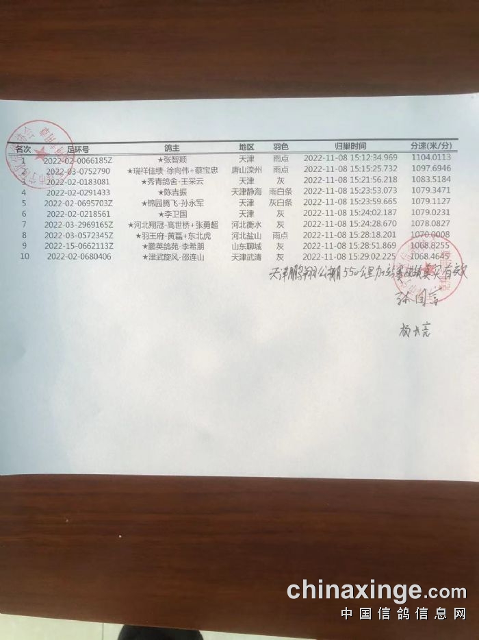 天津鹏翔公棚550公里加战赛(第一关)经由宁河区信鸽协会领导指裁获奖鸽成绩真实有效!