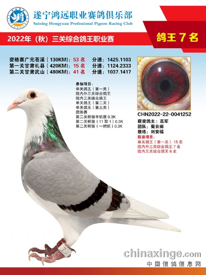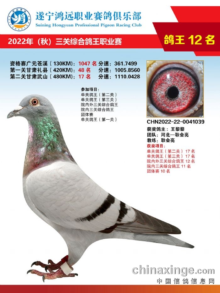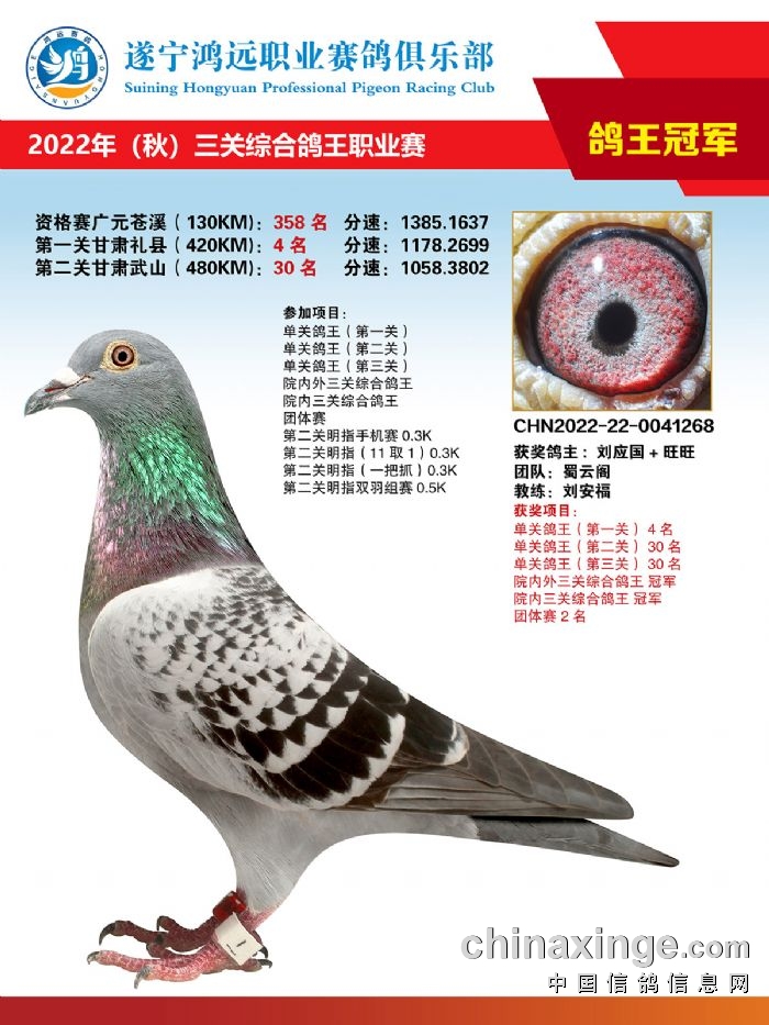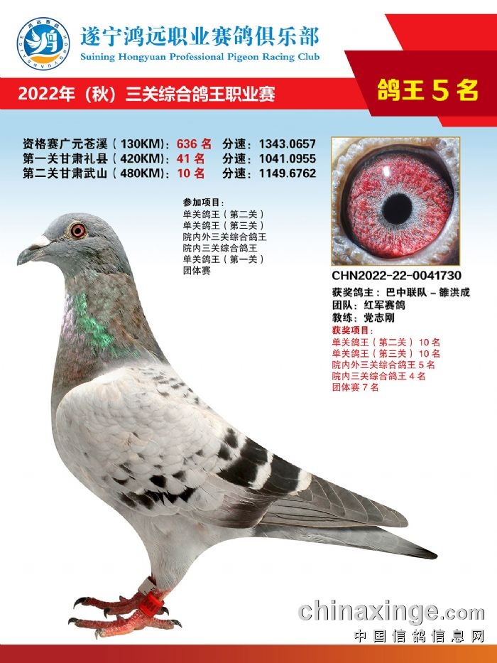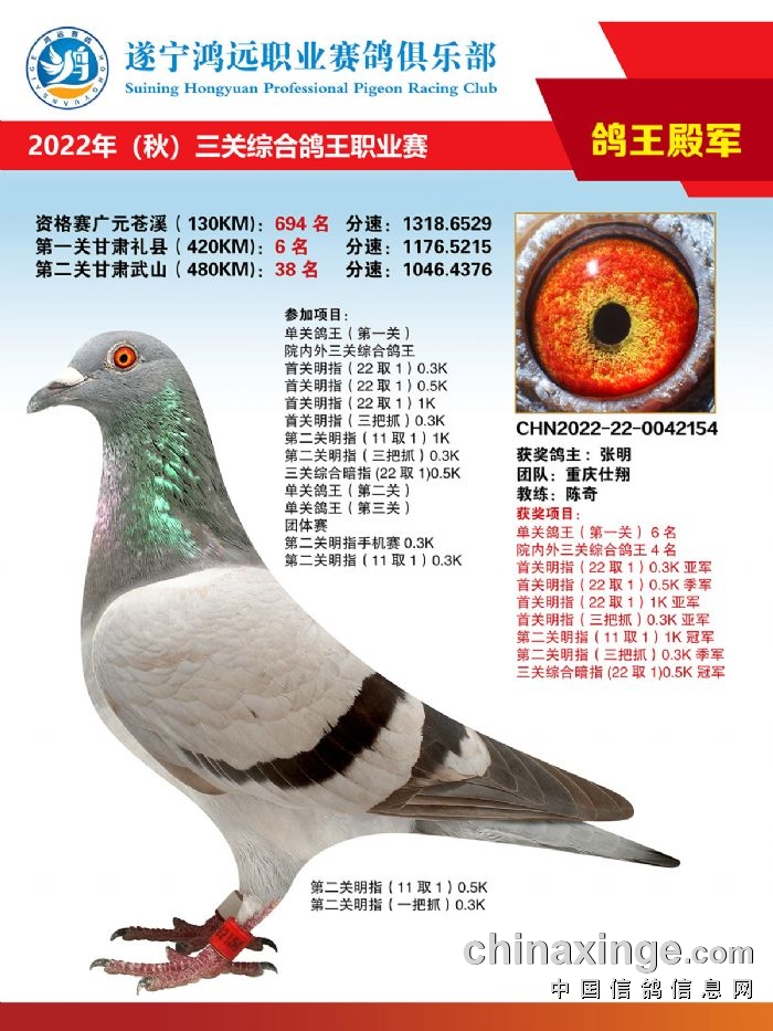 四川鸿远职业赛鸽俱乐部鸽王1-15名