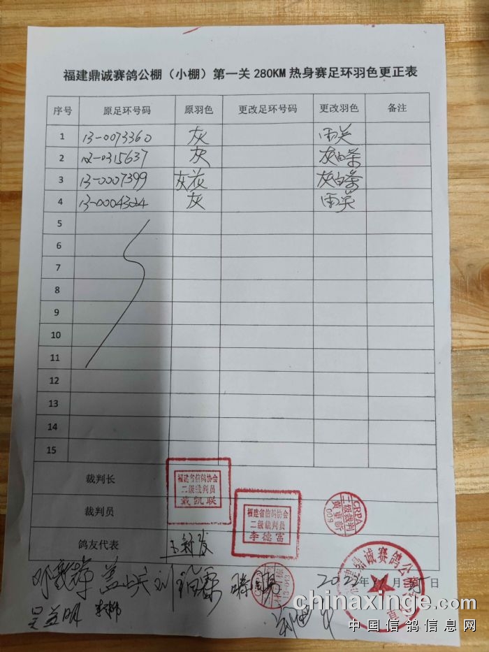 鼎诚(小棚)第三关决赛480KM更改羽色电子环清单