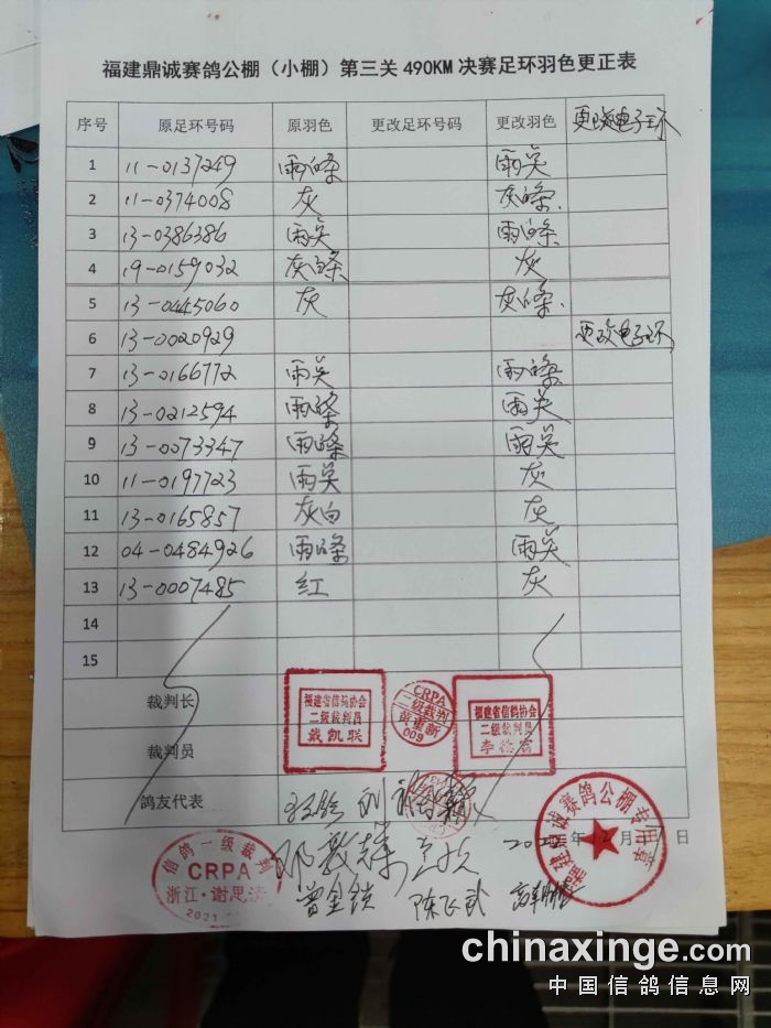 鼎诚(小棚)2022第三关(490KM)决赛集鸽更改羽色、更换电子环清单