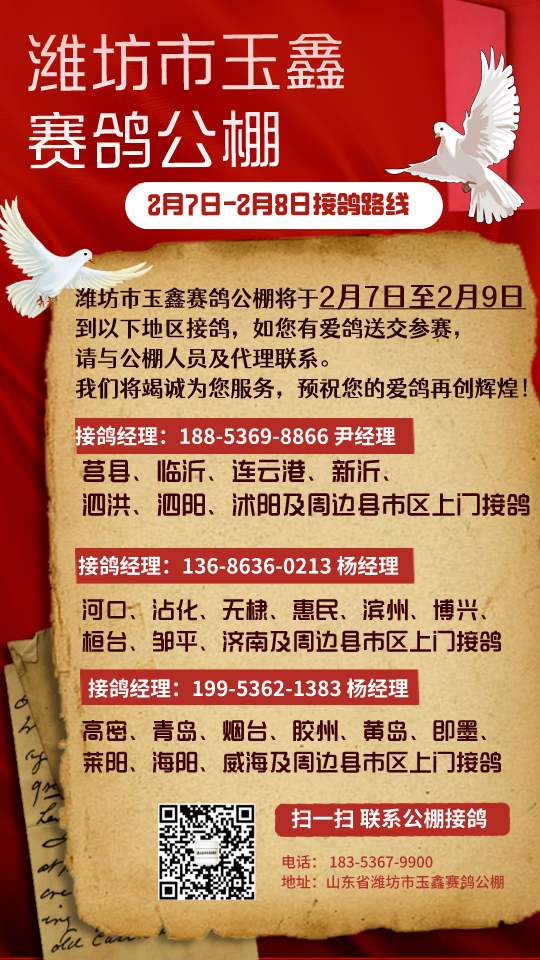 潍坊市玉鑫赛鸽公棚 2月7日-8日接鸽路线