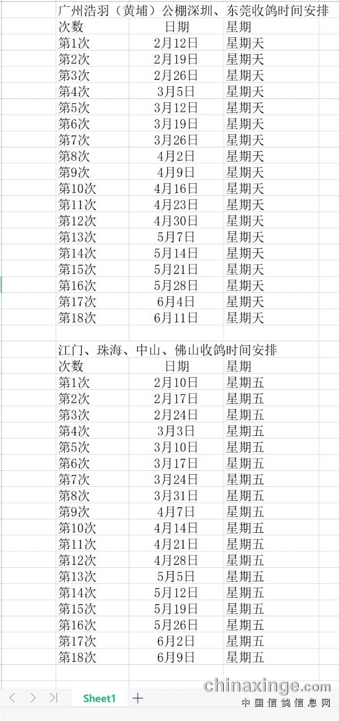 广州浩羽(黄埔)公棚2023年珠三角接鸽时间安排表