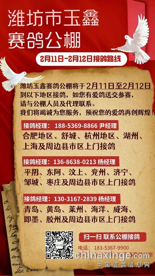 潍坊市玉鑫赛鸽公棚 2月11日-12日接鸽路线