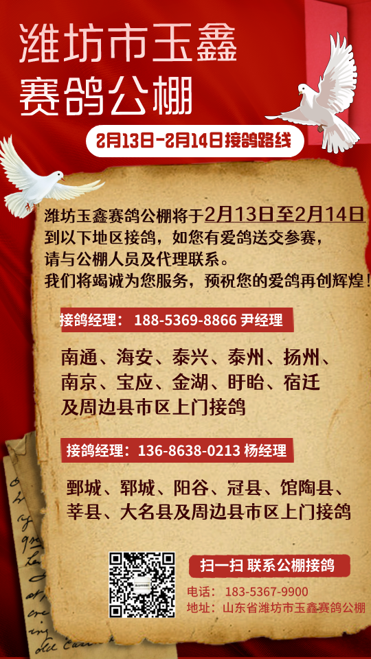潍坊市玉鑫赛鸽公棚 2月13日-14日接鸽路线