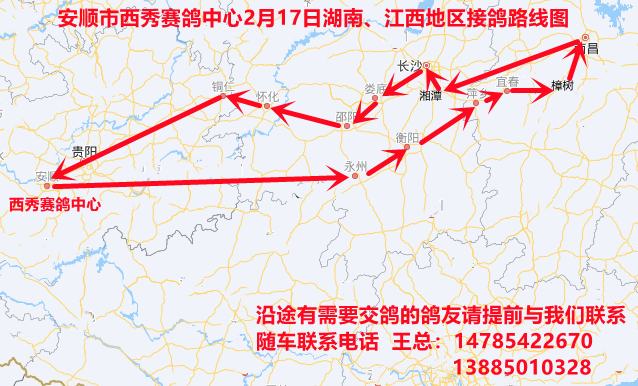 从公棚出发,途经永州、衡阳、萍乡、宜春、樟树、南昌、湘潭、长沙、娄底、邵阳、怀化、铜仁,最后到达安顺市西秀赛鸽中心。