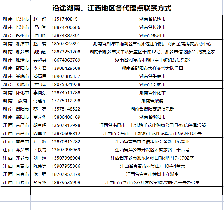 沿途有需要交鸽的鸽友请提前联系我们,请尽量将您的爱鸽交到代理点处。祝广大鸽友凤凰于飞、旗开得胜!