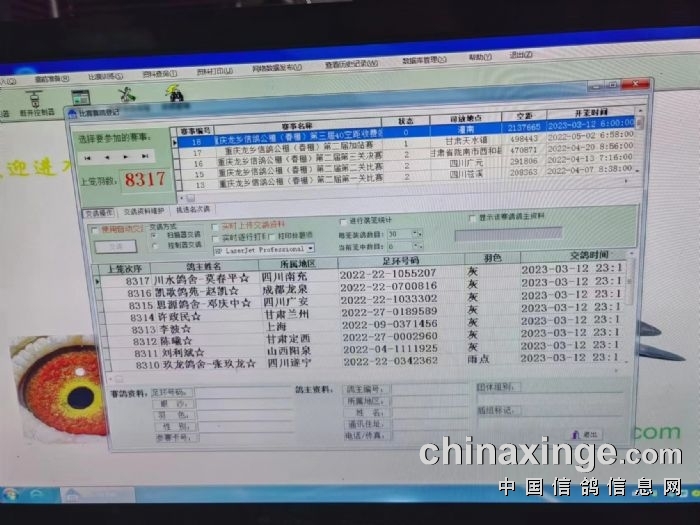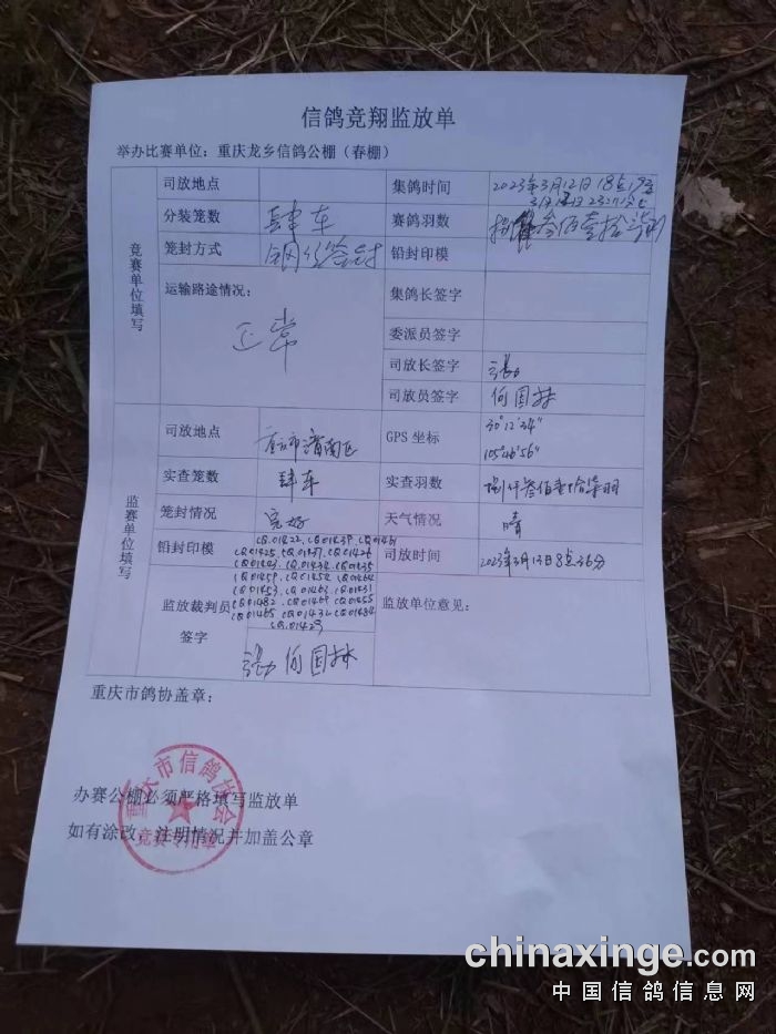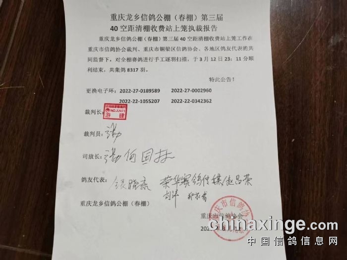 通过数次0-30公里训放重庆龙乡信鸽公棚(春棚)在全国鸽友的大力支持和关怀下定于3月12日下午18点开始,由重庆市信鸽协会 游建 担任本次裁判长,张力担任本次的放飞司放长。 在裁判的监督指导下,多机位进行现场直播,全程集鸽有条不紊的进行。18:18分第一羽扫描上笼,环号:2022-31-0024977;最后一羽在晚上23:11分扫描上笼完毕,环号:2022-22-1055207;总上笼8317羽赛鸽。
