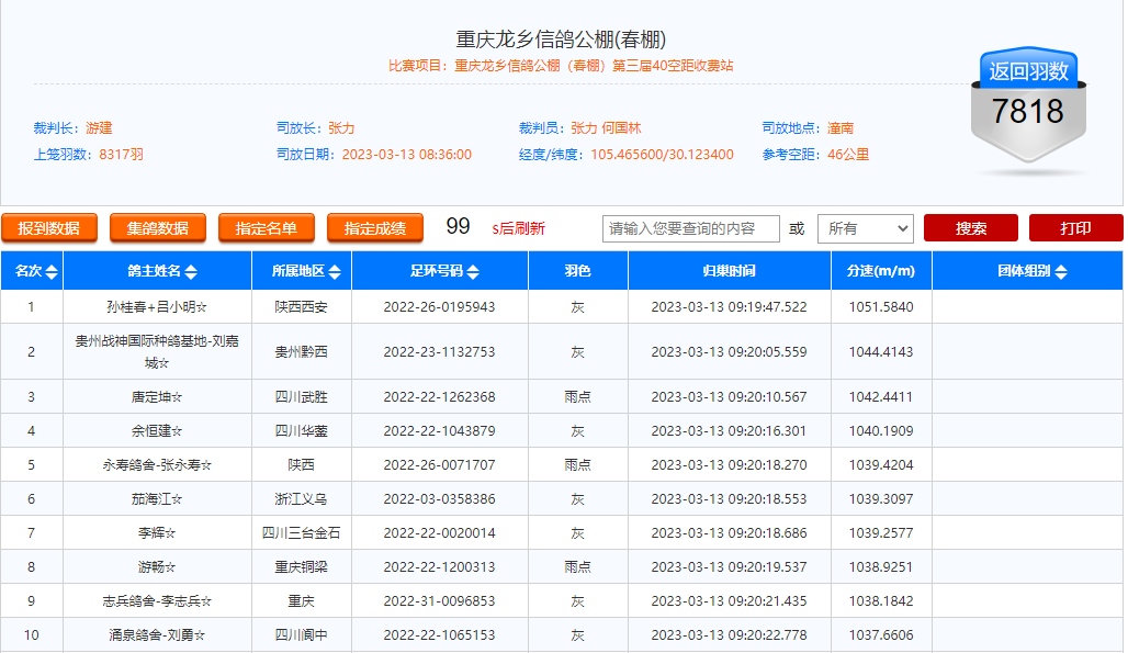 截止发稿前,归巢7818羽,归巢率94%。恭喜重庆龙乡赛鸽公棚(春棚)2023年第三届40空距收费站训放取得圆满成功!