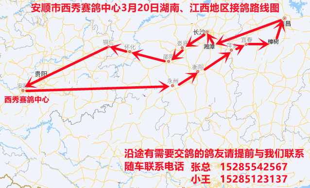 从公棚出发,途经永州、衡阳、萍乡、宜春、樟树、南昌、湘潭、长沙、娄底、邵阳、怀化、铜仁,最后到达安顺市西秀赛鸽中心。