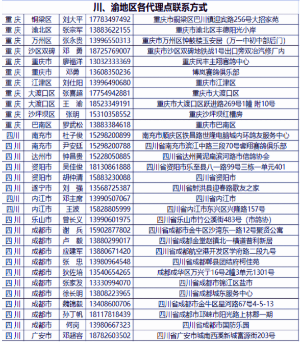 沿途有需要交鸽的鸽友请提前联系我们,请尽量将您的爱鸽交到代理点处。祝广大鸽友凤凰于飞、旗开得胜!