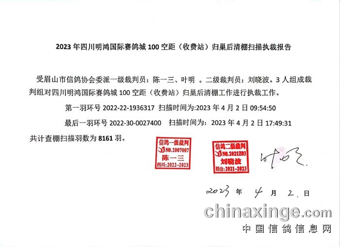 四川明鸿国际赛鸽城(收费站)归巢后清棚扫描执裁报告