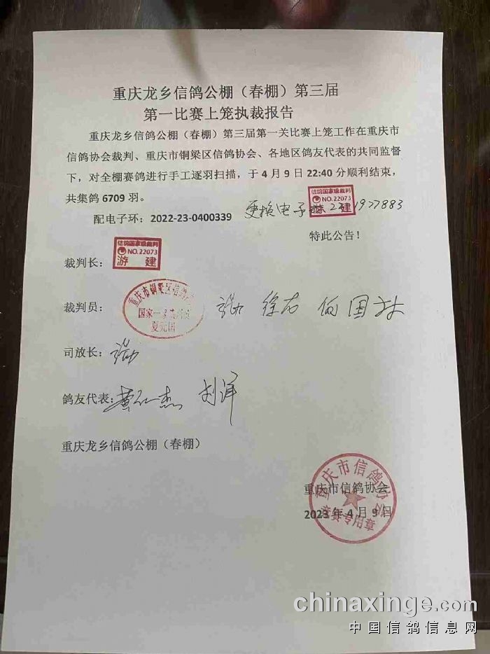 重庆龙乡信鸽公棚(春棚)在全国鸽友的大力支持和关怀下定于4月9日下午开始集鸽,由重庆市信鸽协会 游建 担任本次裁判长,张力担任本次的放飞司放长。 在裁判的监督指导下,多机位进行现场直播,全程集鸽有条不紊的进行。18:46分第一羽扫描上笼,环号:2022-05-0347367;最后一羽在晚上22:40分扫描上笼完毕,环号:2022-04-1111925;总上笼6709羽赛鸽。