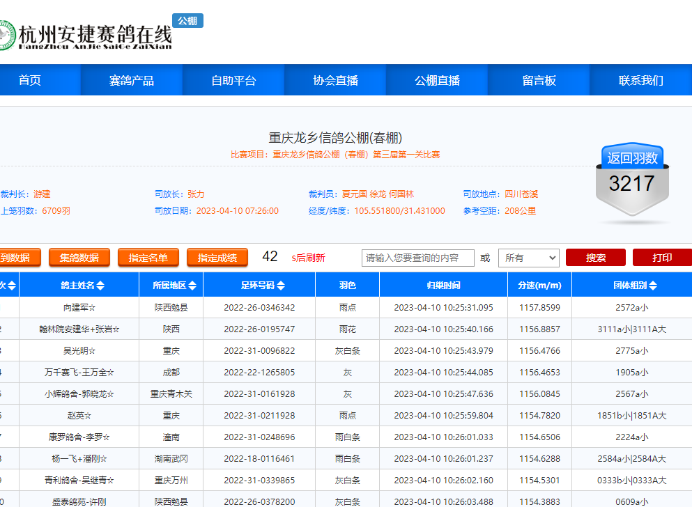 向建军的一羽赛2022-26-0346342于2023-04-10 10:25:31.095以1157.8599米/分的分速夺得冠军;翰林院安建华+张岩的一羽赛鸽2022-26-0195747于2023-04-10 10:25:40.166以1156.8857米/分的分速夺得亚军;吴光明的一羽赛鸽2022-31-0096822于2023-04-10 10:25:43.979以1156.4766米/分的分速夺得季军