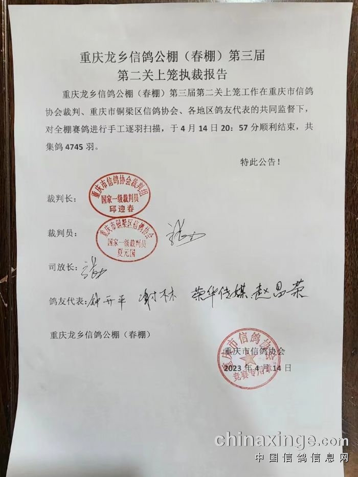 | 重庆龙乡信鸽公棚第二关300公里集鸽工作4月14日晚18点30分开始,由重庆市信鸽协会副主席(国家一级裁判) 邱迎春 担任本次裁判长,一级裁判夏元国;一级裁判张力担任本次的放飞司放长。 在裁判组的监督指导下,现场鸽友铜梁谢林,潼南 钟开平 见证下,赛鸽传媒单位多机位进行现场直播,集鸽全过程有条不紊的进行。18:34分第一羽扫描上笼,环号:2022-23-0706362;最后一羽在20:57分扫描上笼,环号:2022-22-0529846;本次总计上笼4745羽赛鸽。