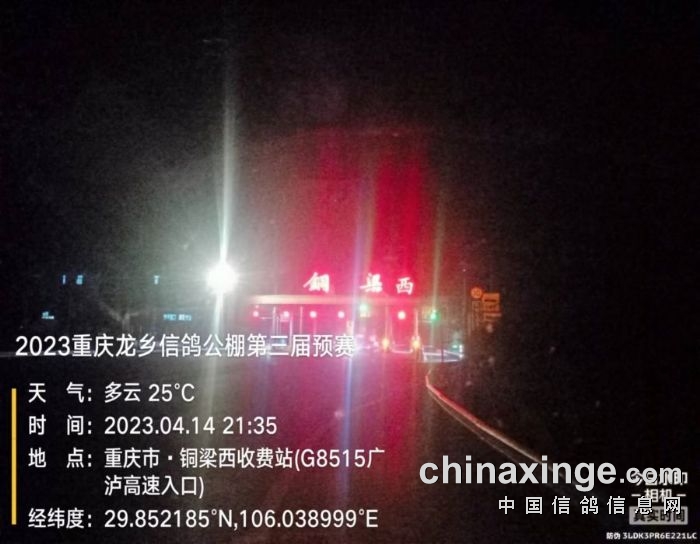 集鸽完成后,晚上21.35分左右集鸽车从重庆铜梁西收费站上高速前往司放地。