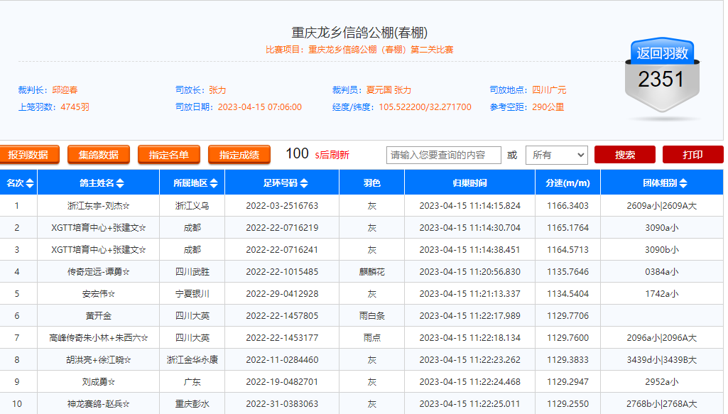 截止发稿前,归巢2351羽,归巢率49.5%。后续敬请关注重庆龙乡信鸽公棚(春棚)!更多精彩赛事关注信*鸽*天*堂APP! |