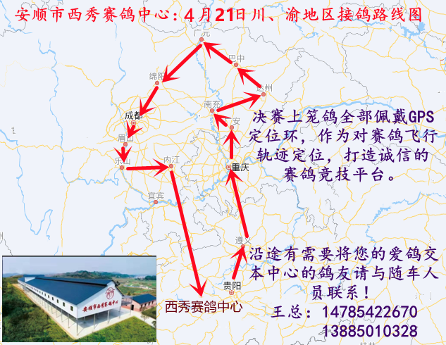 从贵阳出发,途经遵义、重庆、广安、南充、达州、巴中、广元、绵阳、成都、眉山、乐山、内江,最后到达安顺市西秀赛鸽中心。