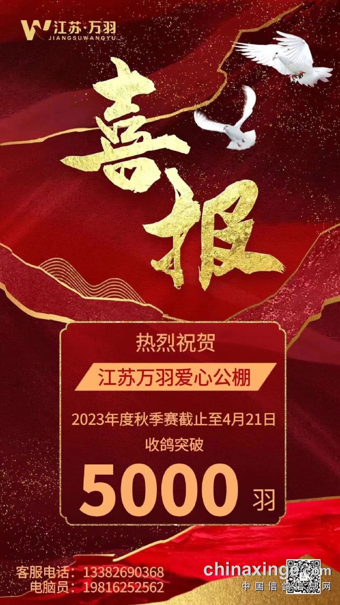 热烈祝贺江苏万羽爱心公棚收鸽突破5000羽