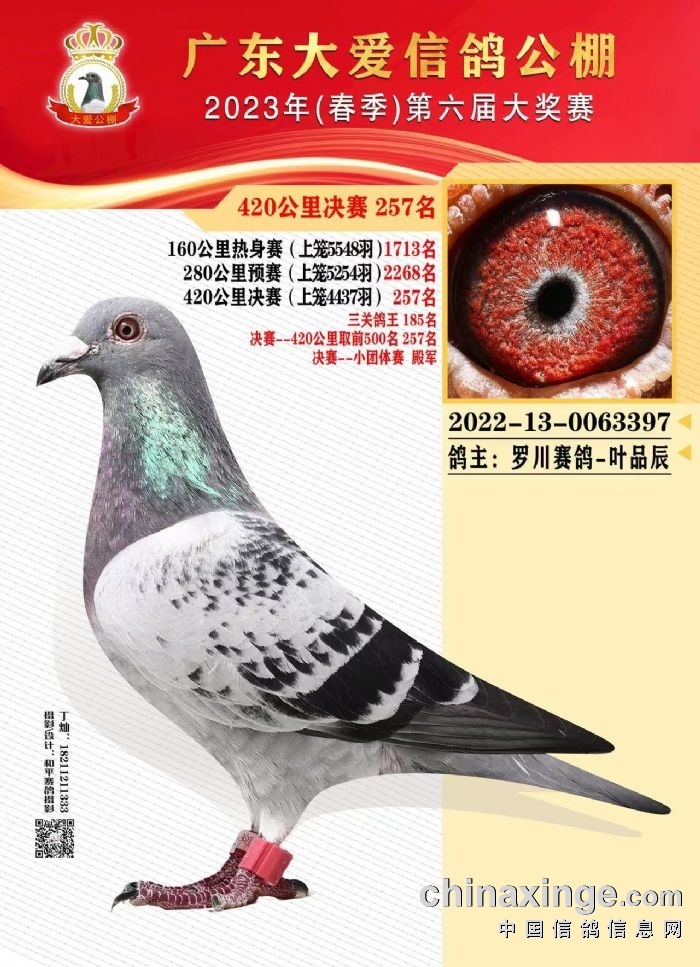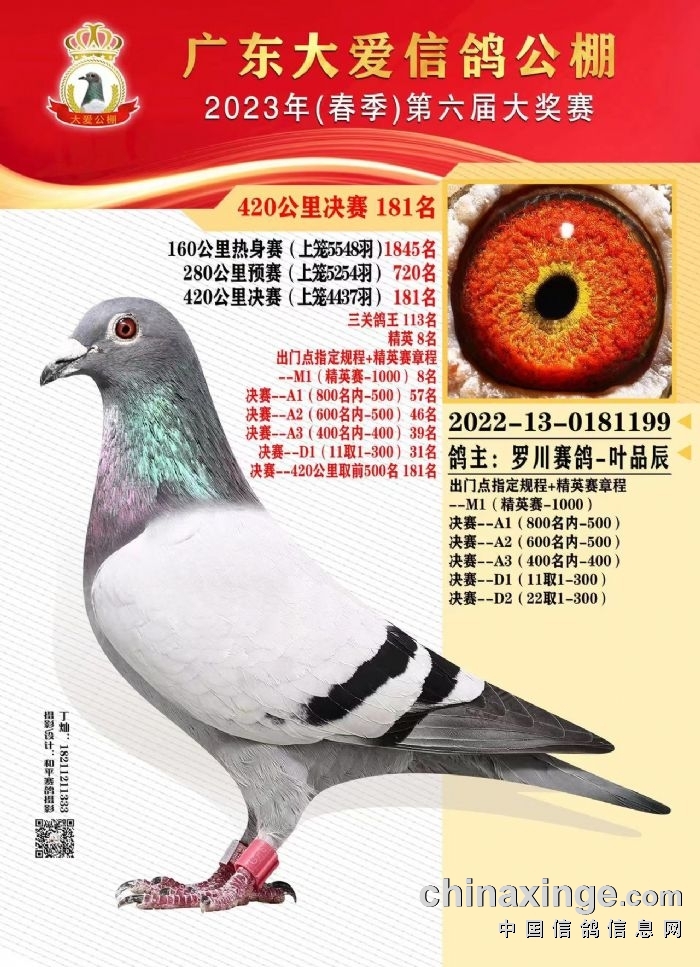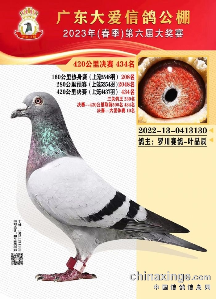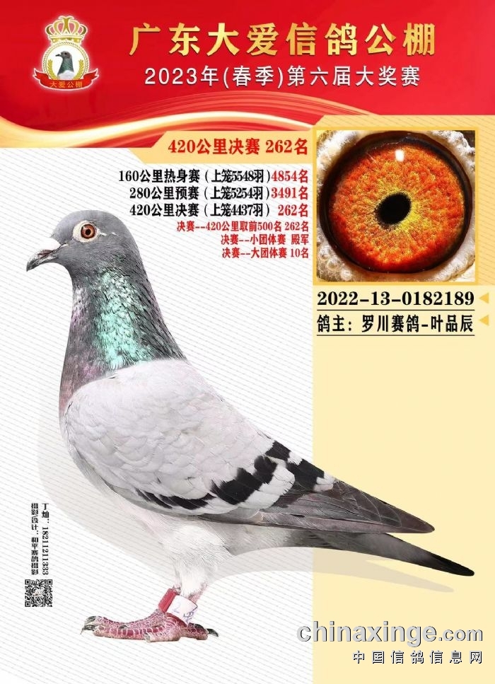 热烈祝贺我棚会员:罗川赛鸽-叶品辰(福建罗源),在广东大爱赛鸽公棚(春棚)决赛(单鸽入赏5羽)荣获181名、257名、262名、434名、481名等优异成绩!