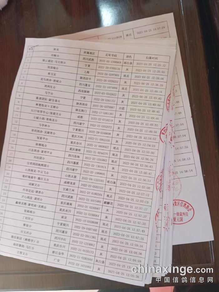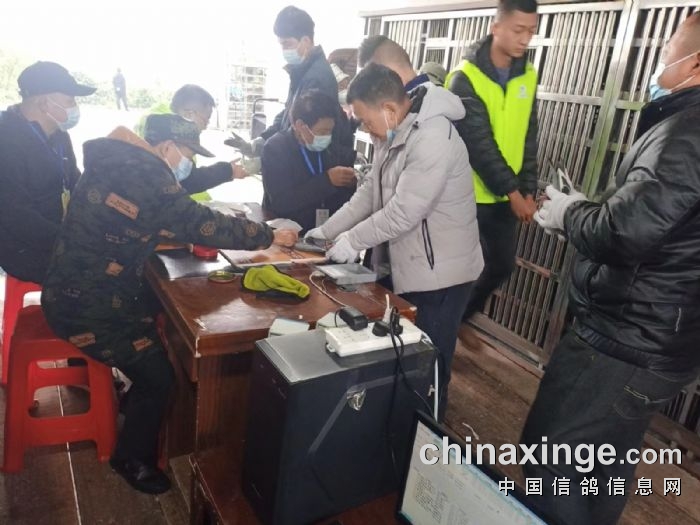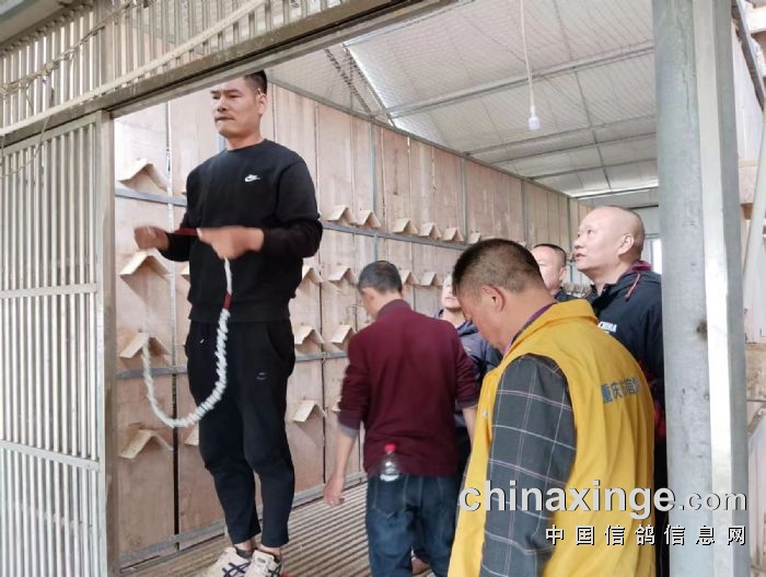 又几分钟后,一梯队从高空归来,前十名报进,裁判和工作人员从棚中抓出。裁判和现场鸽友当众进行比对查验!