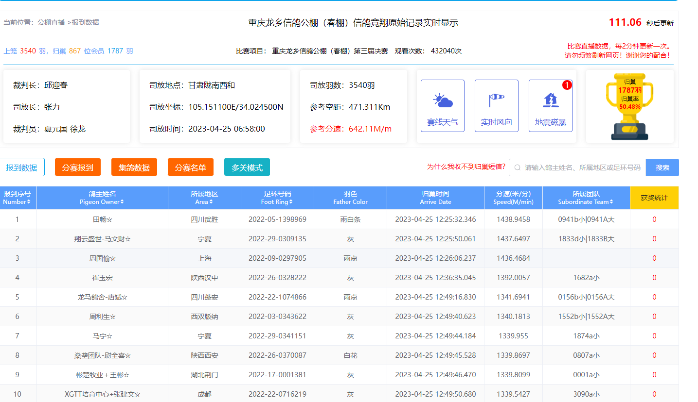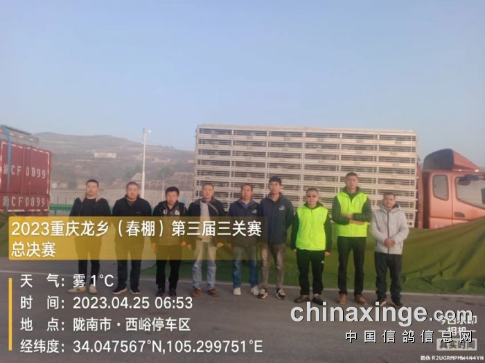 决赛于2023年4月25日晨06:58分在甘肃西和开笼。东经105.115100北纬34.0240 空距471公里,随着裁判员的一声令下,鸽车开笼,3540羽赛鸽有序出笼,赛鸽大军盘旋几圈后冲入天空,踏上归巢的旅程为鸽友们争得好成绩!