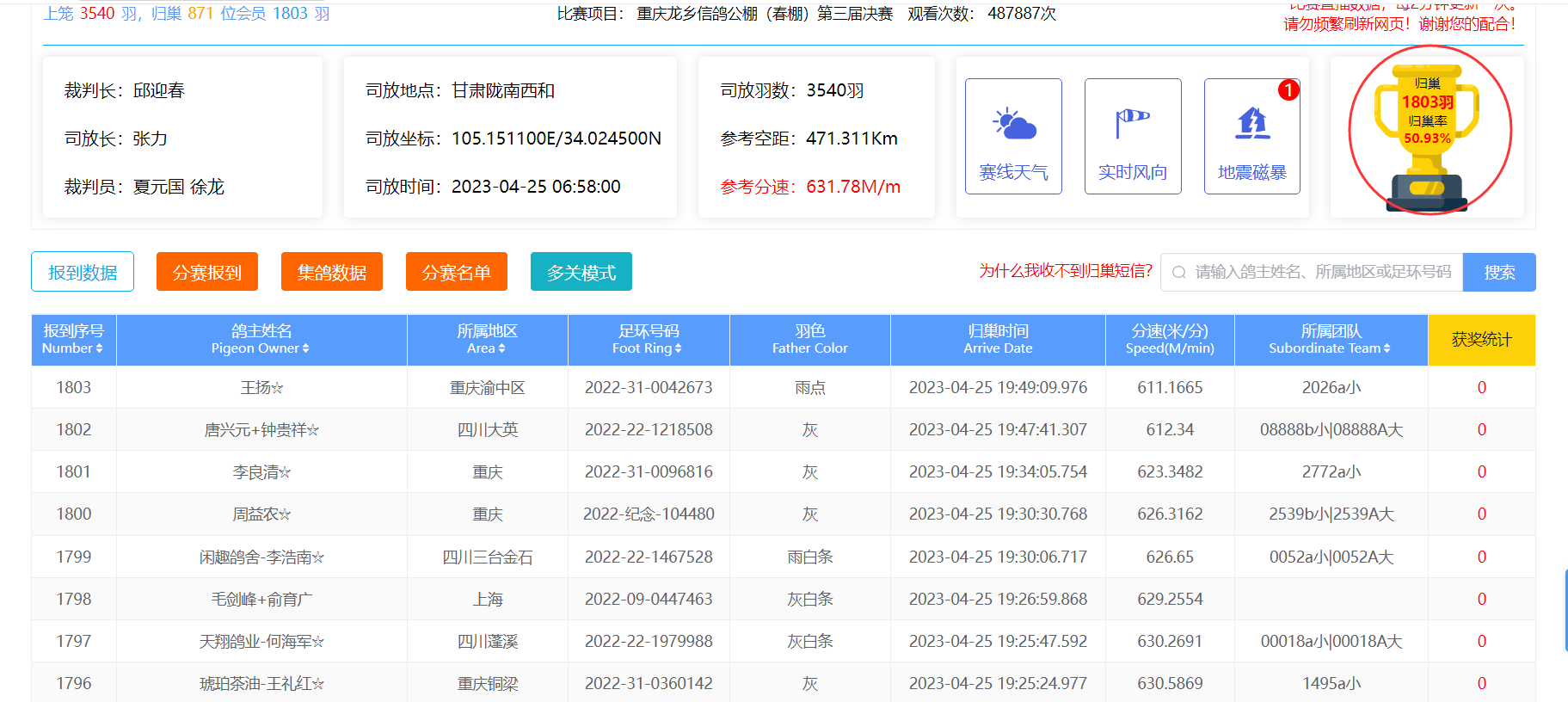 当日归巢1803羽,归巢率为50.93% 重庆龙乡公棚(春)本届总决赛取得圆满成功 !