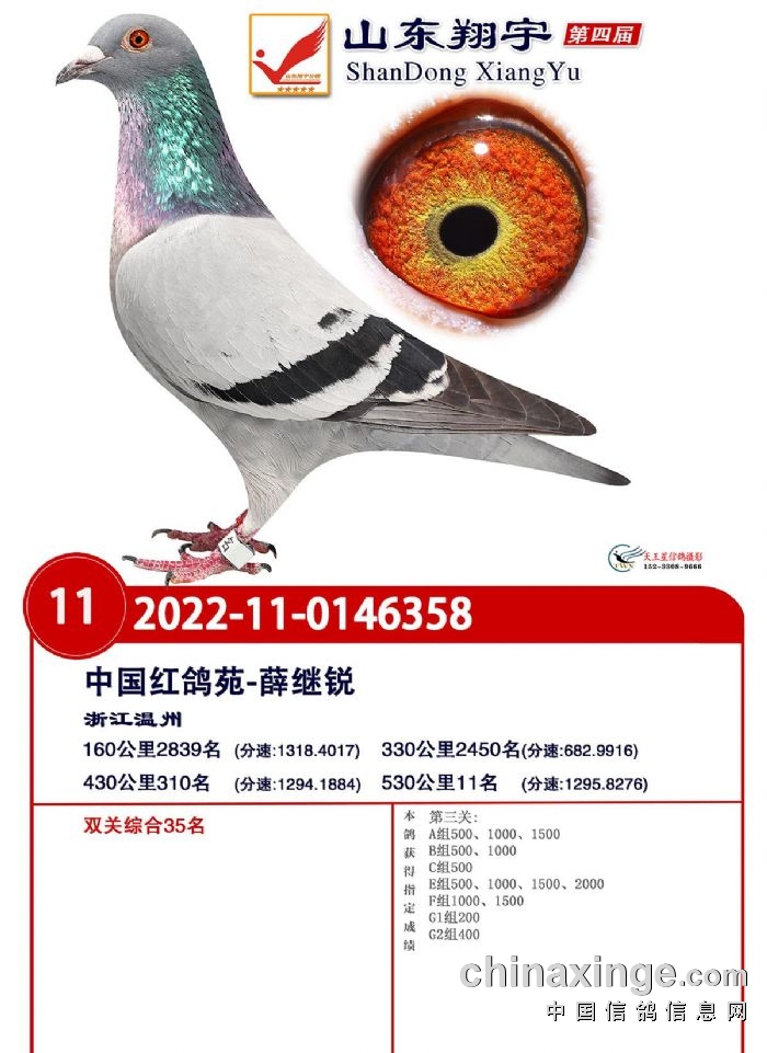 热烈祝贺我棚浙江 温州地区会员:中国红鸽苑-薛继锐,在山东翔宇赛鸽公棚(春棚)决赛中荣获11名优异成绩!