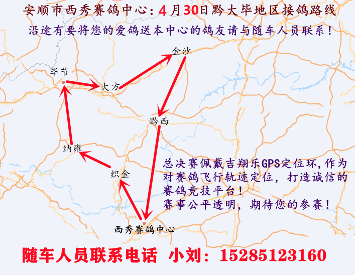 西秀赛鸽中心工作人员将于4月30日(星期日)前往织金、纳雍、赫章、毕节、大方、金沙、黔西等地区收鸽。有需要将您的爱鸽交到西秀赛鸽中心的乡镇会员请提前预约就近高速收费站进行交鸽或提前与本中心工作人员或代理人联系。感谢您的支持与信任!