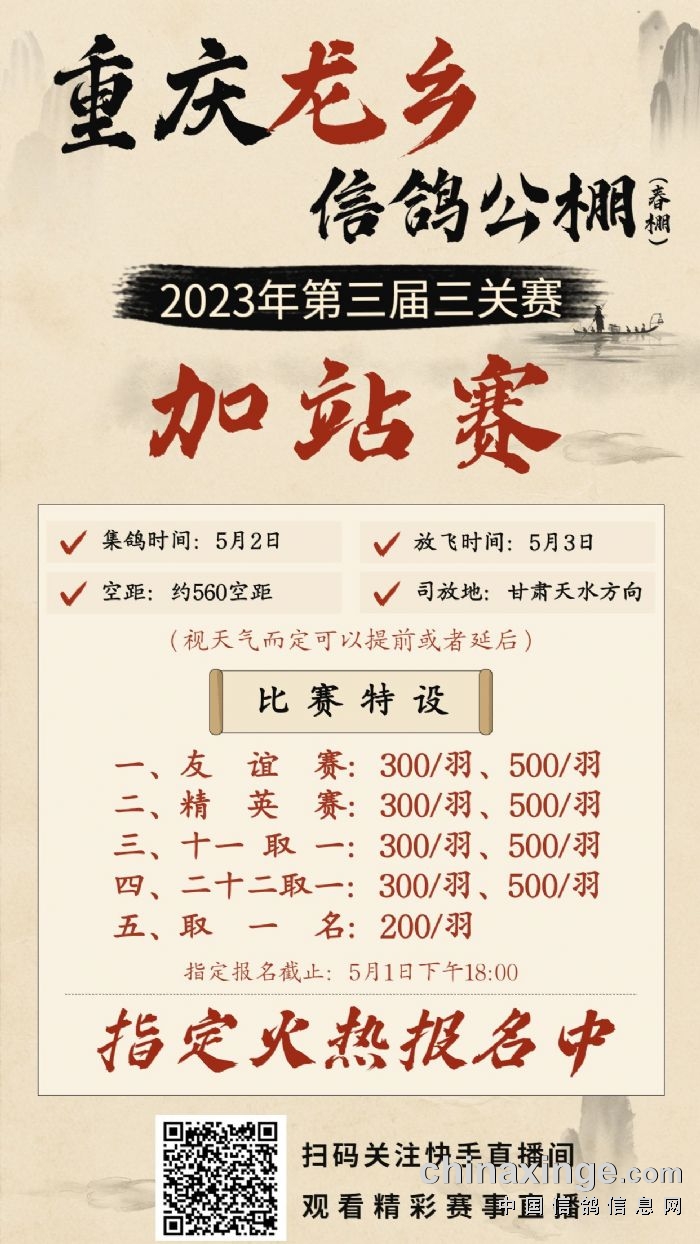 重庆龙乡信鸽公棚(春棚)2023年第三届加站赛集鸽公告