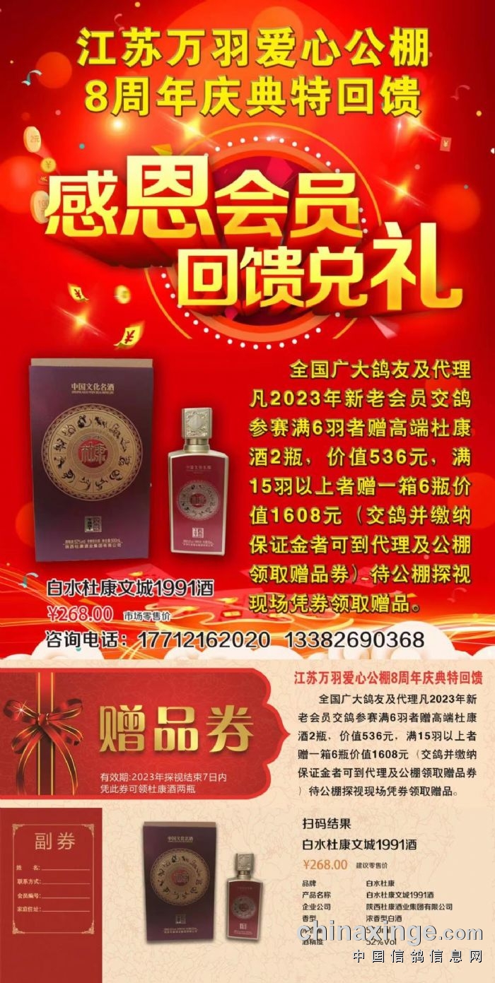 今年适逢万羽爱心公棚8周年庆典,为回馈鸽友的大力支持,2023年所有新老会员,交纳保证金者只要交满1组6羽就可获赠2瓶价值536元高端杜康酒,送15羽以上可享6瓶(1箱)价值1608元高端杜康酒。待公棚探视现场领取赠品。这看得见、摸得着的福利,是公棚对所有来参赛会员的奖励,对鸽友们来说交鸽达标,奖品唾手可得。