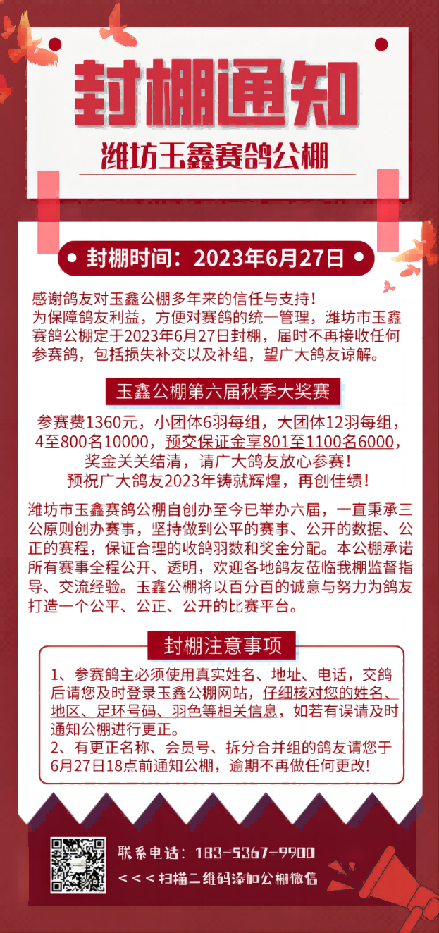 潍坊市玉鑫赛鸽公棚 封棚通知