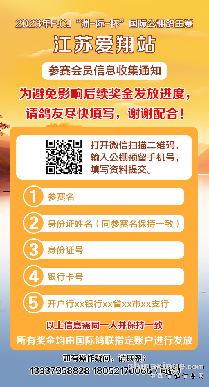 2023年国.际.鸽.联“洲-际-杯”江苏爱翔分站,所有奖金均由国.际.鸽.联指定账户直接发放。根据国.际.鸽.联要求:所有参赛会员必须实名制,所有获奖会员必须参赛名、身份证、银行卡户名一致领取奖金,现需要您提供以下信息,用于奖金发放: