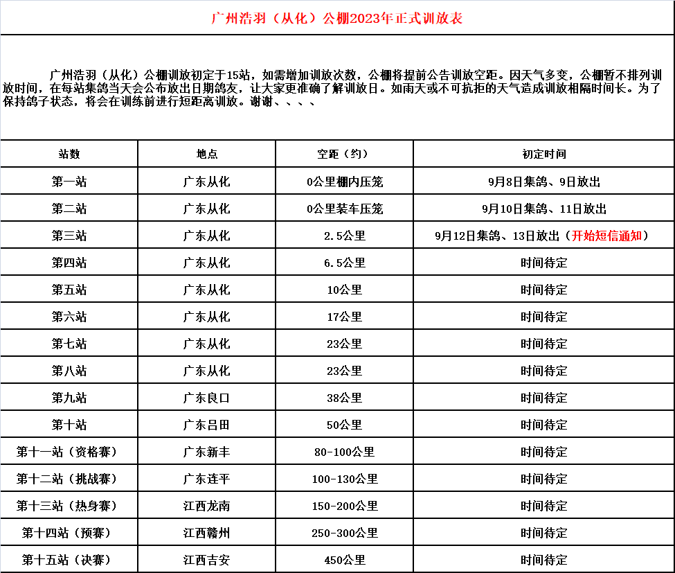 秋季训练开始起航了。本棚定于9月12日集鸽,9月13日放出,空距约2.5公里。因近日雨水较多,开笼时间根据天气而定,请关注训练数据扫描链接。公棚同时会在快手直播归巢实况(公棚快手号:H13544511558),为了加强鸽子体质,放飞归巢时公棚将会继续强制家飞,快手直播链接将会分享于微信群及朋友圈,敬请大家的查阅和观看。