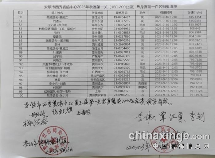 西秀赛鸽:2023年秋赛第一关热身赛前100名获奖名单