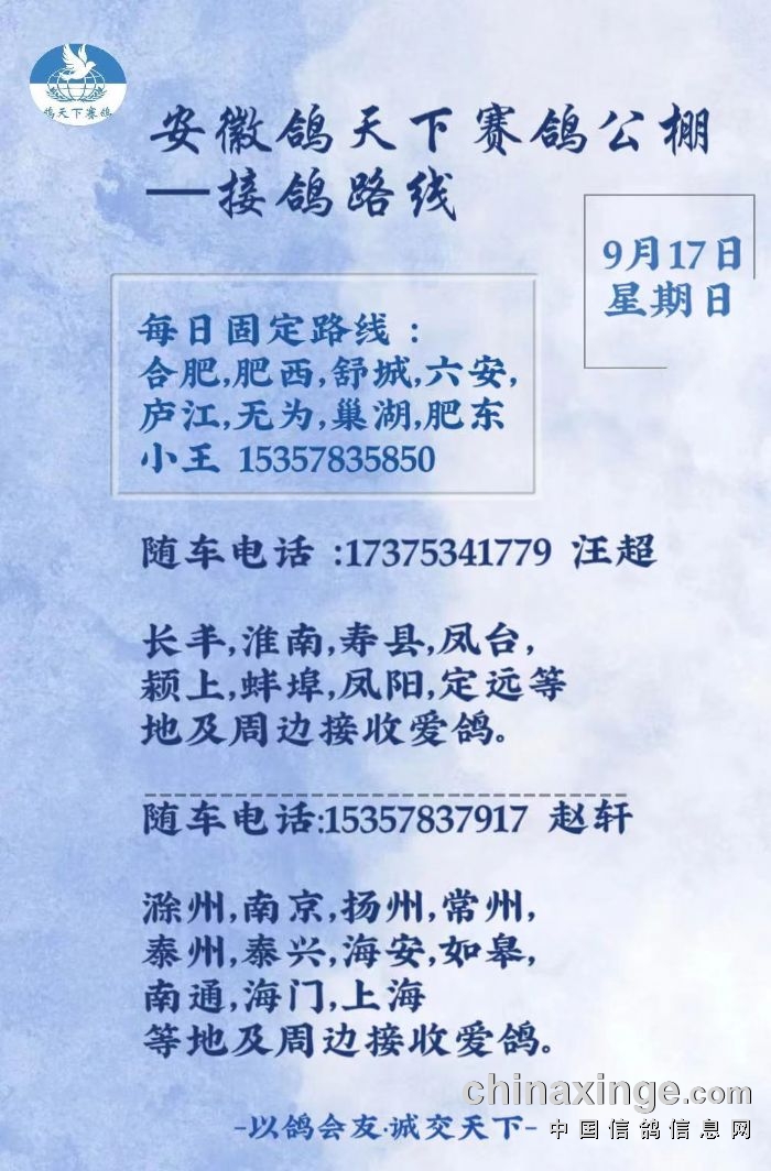 安徽鸽天下赛鸽公棚(春棚)-接鸽路线