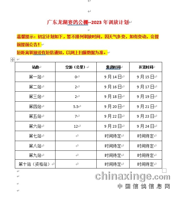 广东龙湖公棚第六站约12公里训放定于9月23号晚集鸽,24号早上开笼。如遇恶劣天气改期另行通知!