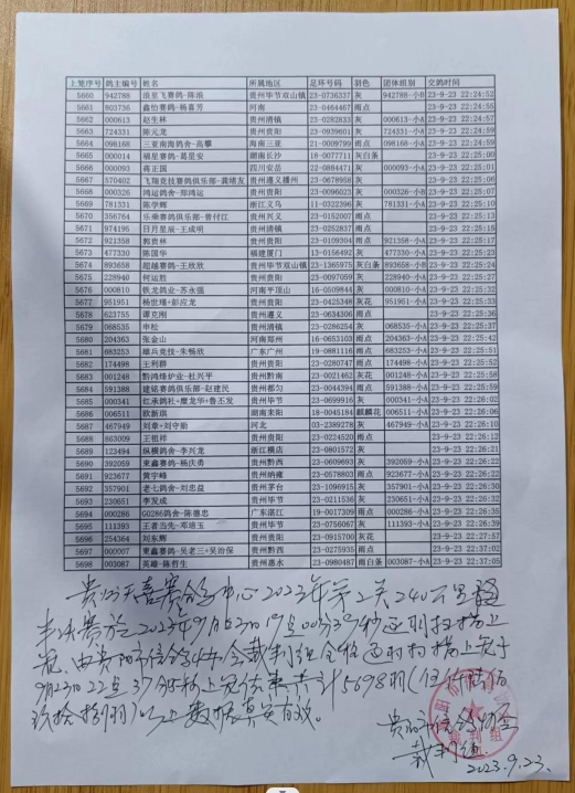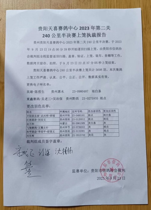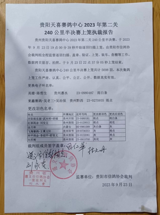 贵阳天喜赛鸽中心第二关240公里半决赛逐羽上笼清单