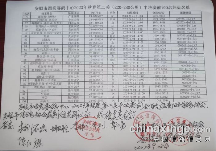 西秀赛鸽:2023年秋赛第二关半决赛前100名获奖名单