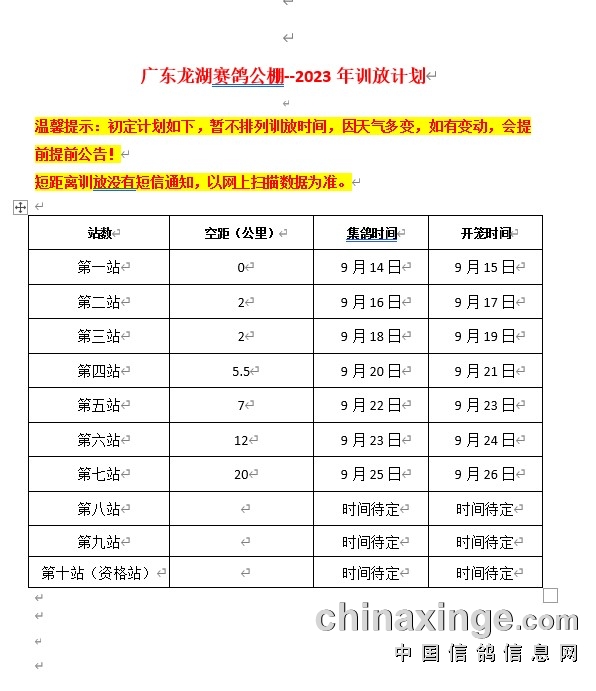 广东龙湖公棚第七站约20公里训放定于9月25号晚集鸽,26号早上开笼。如遇恶劣天气改期另行通知!