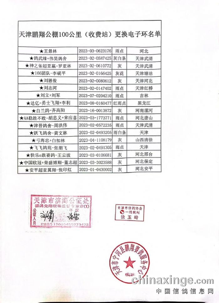 天津鹏翔公棚100公里(收费站)更换电子环名单