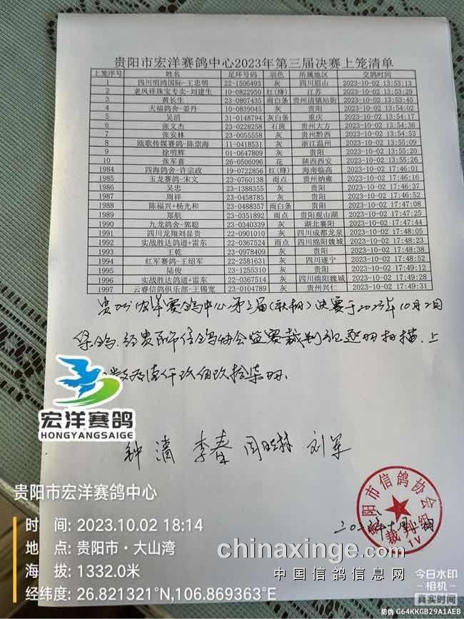 贵阳市宏洋赛鸽中心2023年决赛上笼清单