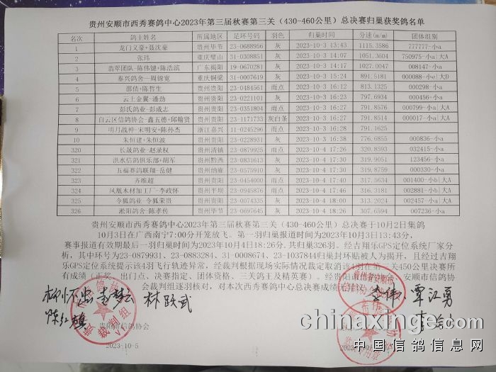 西秀赛鸽:2023年秋季竞赛第三关总决赛归巢清单