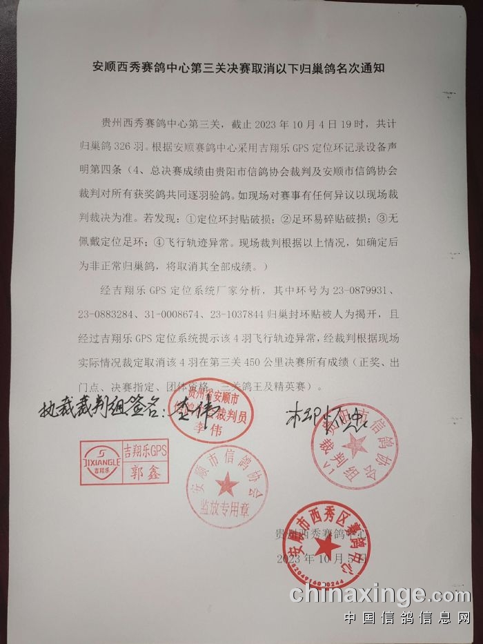 西秀赛鸽中心第三关决赛取消以下归巢鸽名次通知