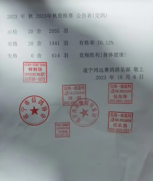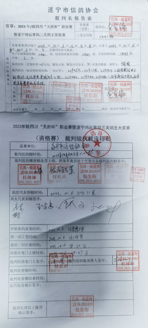 2023年秋四川“天府杯”职业赛暨遂宁鸿远赛鸽三关鸽王大奖赛资格赛集鸽工作在遂宁市信鸽协会委派裁判认真执裁下,经全体参赛团队及鸽友代表积极参与和监督,已于2023年10月6日20时圆满结束。总集鸽羽数1441羽。现将集鸽执裁报告及相关数据公示如下(所有集鸽原始单据、存根由执裁裁判保管,待比赛结束验鸽时开启核对):