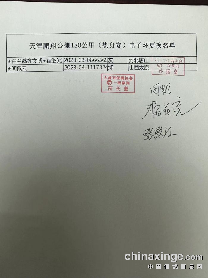 天津鹏翔公棚180公里(热身赛)更换电子环名单
