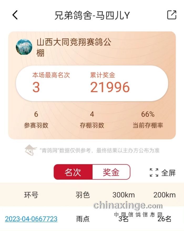 恭贺我棚会员,兄弟鸽舍—马四儿在竞翔赛鸽公棚热身赛26名、预赛3名好成绩并且指定赢得大奖。