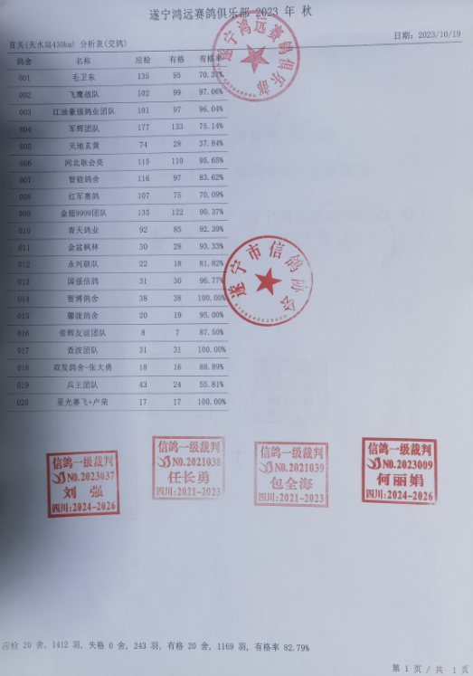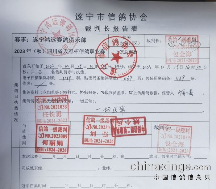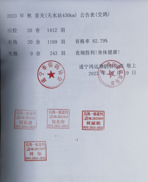 2023年秋四川“天府杯”职业赛暨遂宁鸿远赛鸽三关鸽王大奖首关(天水站)赛集鸽工作在遂宁市信鸽协会委派裁判认真执裁下,经全体参赛团队及鸽友代表积极参与和监督,已于2023年10月19日18时圆满结束。总集鸽羽数1169羽。现将集鸽执裁报告及相关数据公示如下(所有集鸽原始单据、存根由执裁裁判保管,待比赛结束验鸽时开启核对)。