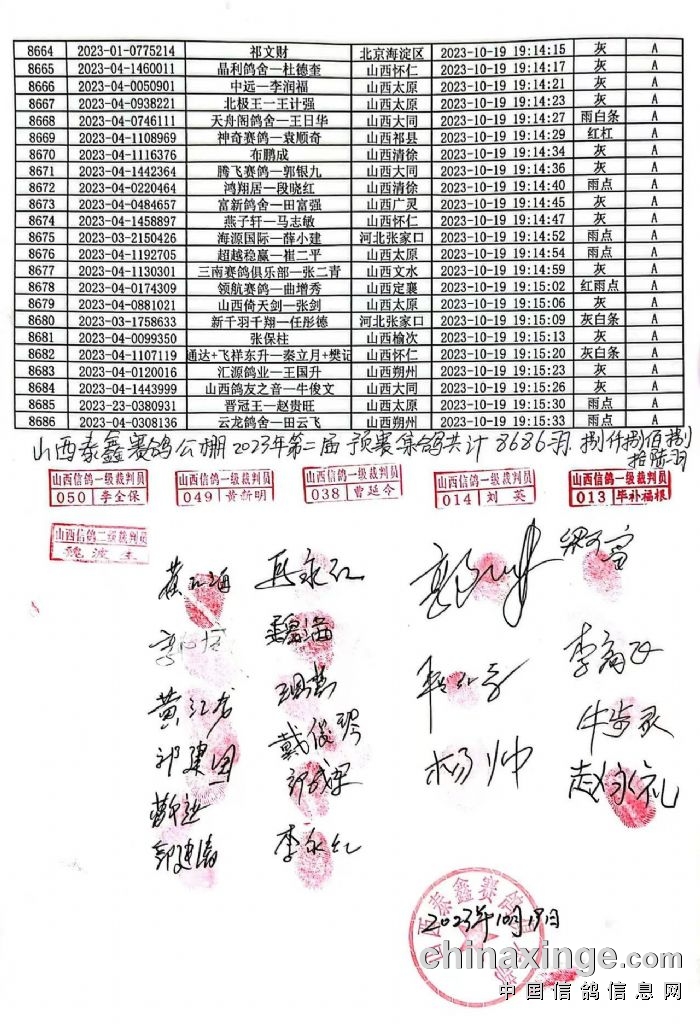 2023年第二届山西泰鑫赛鸽公棚预赛执行裁判及鸽友代表签字确认