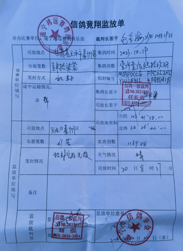 2023年秋四川“天府杯”信鸽职业赛暨遂宁鸿远赛鸽首关天水站430公里。于10月20日早上8:17分放出,天气良好,鸽群走势良好,预祝大家取得好成绩!