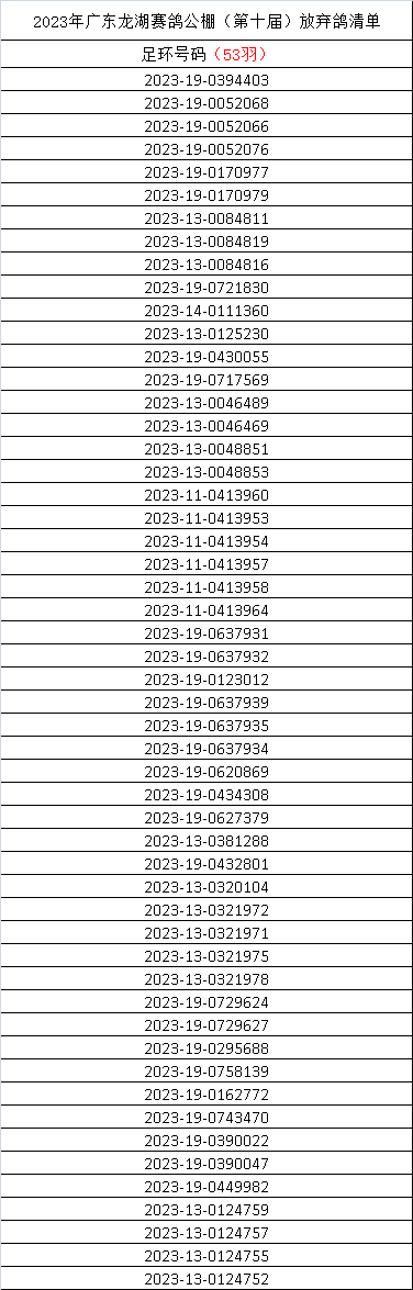 2023年广东龙湖赛鸽公棚(第十届)放弃鸽清单